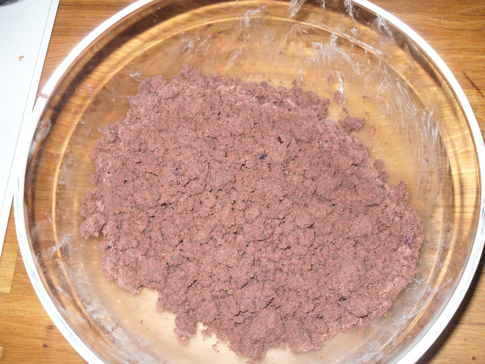 Sollte ein gekaufter Kuchen verwendet werden die Glasur entfernen. Im Anschluss den Kuchen fein zerbröseln. Hierfür kann entweder eine Küchenmaschine verwendet werden oder der Kuchen zu nächsten in Scheiben, dann Würfel geschnitten werden und im Anschluss mit den Fingern zerbröseln.